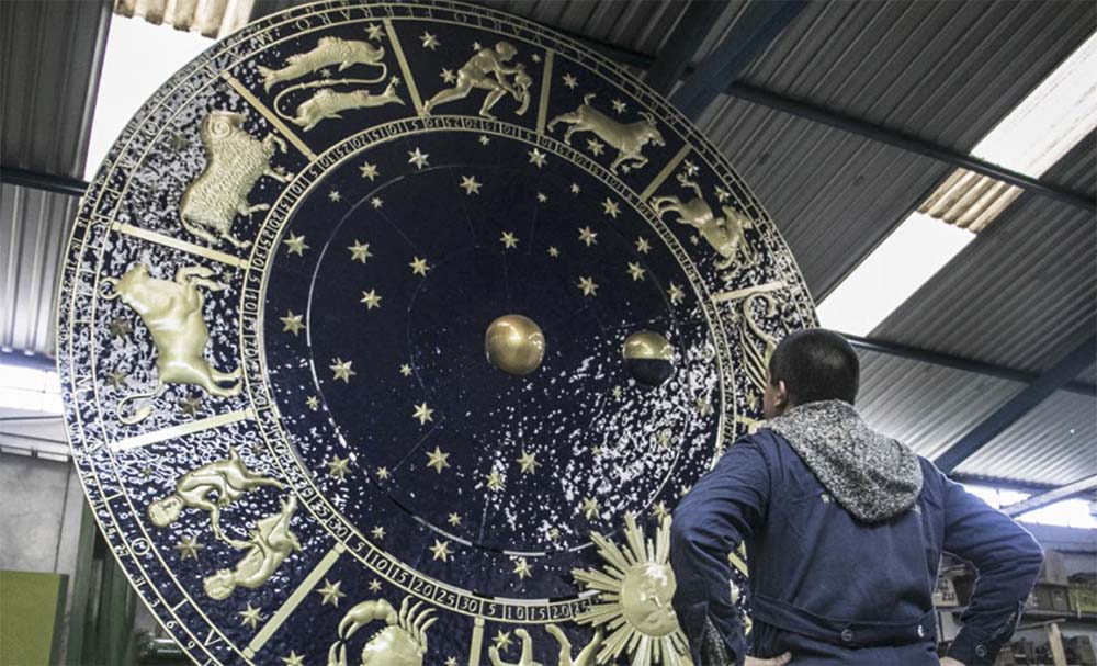También cuenta con características astronómicas, mostrando el signo zodiacal correspondiente a la fecha marcada por el mismo reloj, y las constelaciones, representadas por 94 estrellas. Con medida de 3.05m de diámetro la carátula del reloj astrológico, englobó todo un proceso que inició con el dibujo lineal de cada uno de los símbolos hasta concluirlos en el proceso de fundición.
